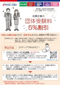 東京商工会議所主催 検定試験では同一の企業・学校単位で1つの検定試験を受験する際、受験人数が3名以上の場合には「団体申込」が利用可能です。