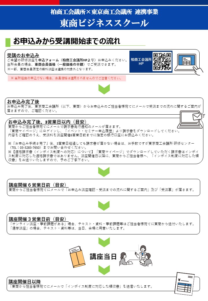 ※受講したい講座の講座開催日が7~10日前など、開催日まで日数が少ない場合は柏商工会議所(TEL:04-7162-3315)までご連絡ください。